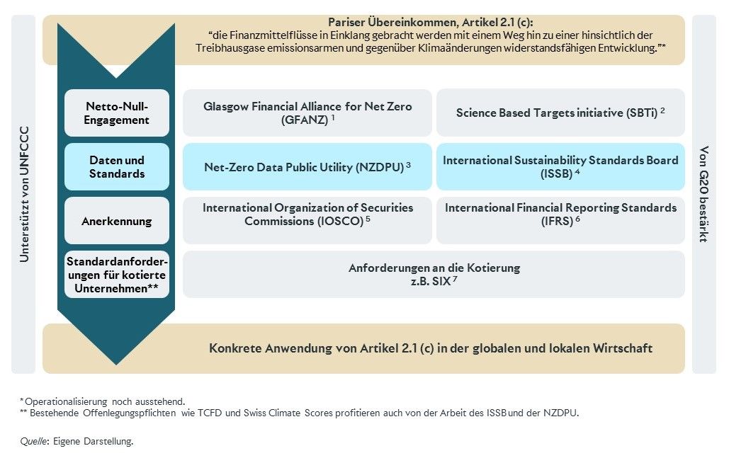 So haben alle Stakeholder einen einfachen Zugang zu den klimatransitionsbezogenen Daten, Verpflichtungen und Fortschritten von Unternehmen und Finanzinstituten. Auch haben die International Financial Reporting Standards (IFRS) und IOSCO den beiden Initiativen ihre Anerkennung und Unterstützung zugesagt, womit faktisch der internationale Standard gegeben ist. Das heisst, Daten und Standards fliessen über diese Anerkennung in die Standardanforderungen für kotierte Unternehmen und finden somit in der Wirtschaft Anwendung. Eine dafür entsprechende Regulierung wird daher nicht benötigt.