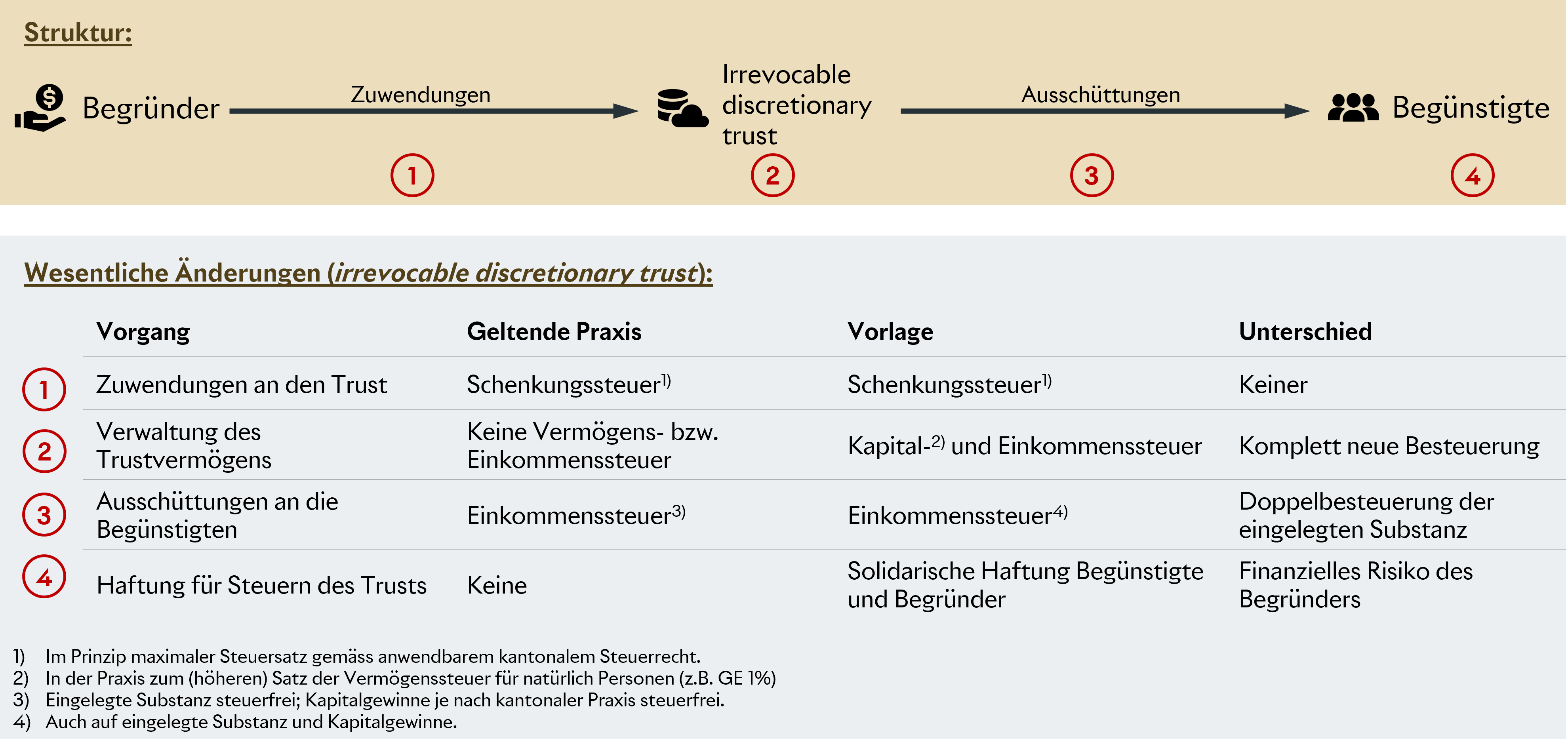 Der Vorschlag stellt eine wesentliche Verschlechterung gegenüber der geltenden Steuerpraxis dar. Besonders verbreitet ist der sogenannte irrevocable discretionary trust durch einen Begründer im Ausland. Letzterer würde gleich in mehrfacher Hinsicht benachteiligt, sowohl gegenüber seiner heutigen Behandlung als auch gegenüber ähnlichen Rechtsinstrumenten. Die folgende Übersicht fasst die wesentlichen Änderungen für den irrevocable discretionary trust gegenüber dem heutigen Recht zusammen: