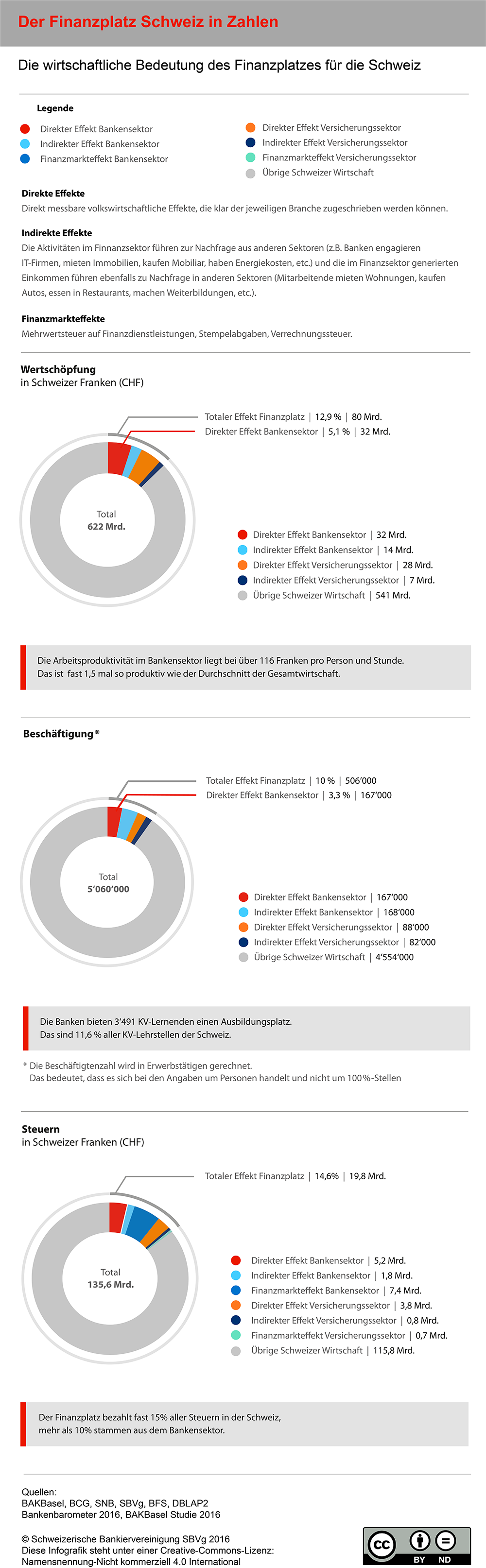 Modellberechnungen von BAKBASEL zeigen auf, dass im Jahr 2015 aus der wirtschaftlichen Tätigkeit des Finanzsektors insgesamt eine Wertschöpfung von CHF 80.3 Mia. resultierte. Das entspricht 12.9 Prozent der gesamtwirtschaftlichen Bruttowertschöpfung. Damit verbunden sind 10 Prozent (400‘000 Vollzeitäquivalente) aller Arbeitsplätze der Schweiz. Von diesen Effekten profitieren auch Bund, Kantone und Gemeinden in Form von Steuererträgen in Höhe von rund CHF 19.8 Mia. Zum Vergleich: Dies entspricht 14.6 Prozent der gesamten Fiskalerträge von Bund, Kantonen und Gemeinden oder einem Grossteil der gesamten Ausgaben des Bundes für die soziale Wohlfahrt (CHF 22.0 Mia.).