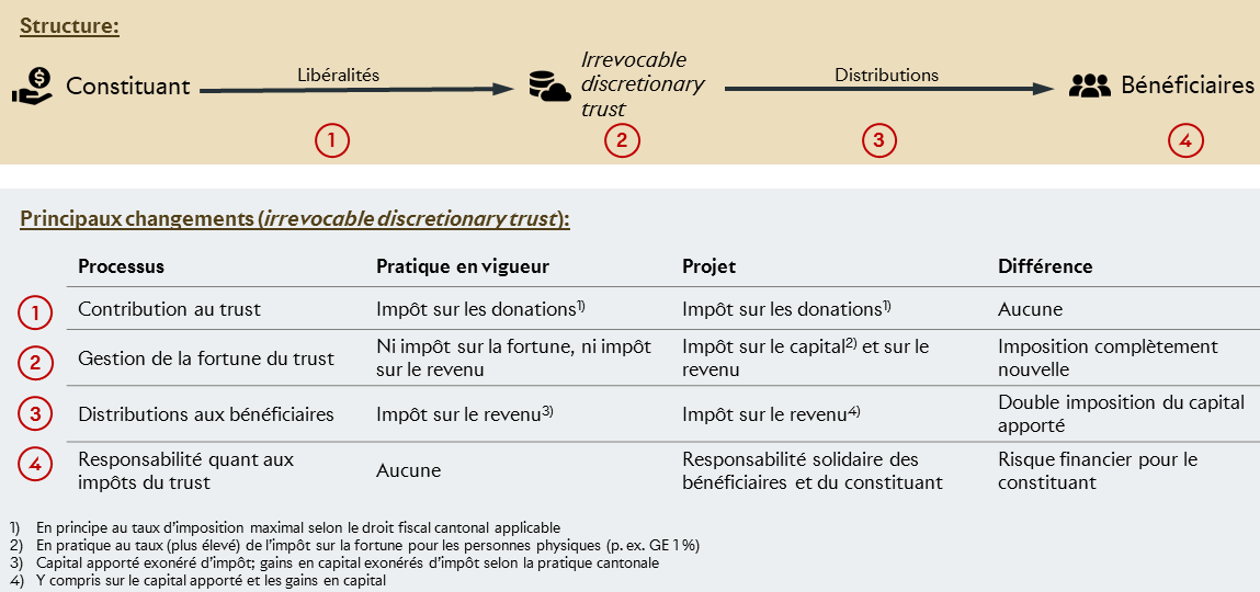 La proposition du Conseil fédéral aboutirait à une nette dégradation par rapport à la pratique fiscale actuelle. Parmi les trusts les plus répandus figure l’irrevocable discretionary trust dont le constituant réside à l’étranger. Cette forme de trust serait pénalisée à plusieurs égards, à la fois par rapport à son traitement actuel et par rapport à d’autres instruments juridiques comparables. Voici un bref récapitulatif des principaux changements concernant l’irrevocable discretionary trust au regard du droit en vigueur: