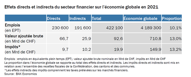 Le secteur financier prouve son importance: en 2021, les 230 600 collaboratrices et collaborateurs (en équivalent temps plein) des banques et des assurances ont généré une valeur ajoutée brute de 66,7 milliards de CHF. Grâce à la demande de consommation intermédiaire (par exemple pour les services informatiques ou de conseil) et aux dépenses de consommation des employé.e.s, le secteur financier donne également des impulsions décisives à d’autres branches. Ces effets indirects ont généré une valeur ajoutée brute totale de 92,6 milliards de CHF le long des chaînes de valeur ajoutée des banques et des assurances en 2021. 422 100 emplois à temps plein étaient ainsi liés à la branche. Pour 100 emplois dans le secteur financier, 83 emplois supplémentaires sont ainsi créés dans d'autres branches suisses. En d’autres termes, plus d’un franc de valeur ajoutée sur huit et un emploi sur dix sont imputables à l’activité du secteur financier. Le secteur financier fait ainsi partie des branches les plus productives de l’économie suisse. Si l’on ne considère que les banques, leur valeur ajoutée en 2021, soit 30,9 milliards de CHF, se situe à peu près au même niveau que celle de la branche pharmaceutique.