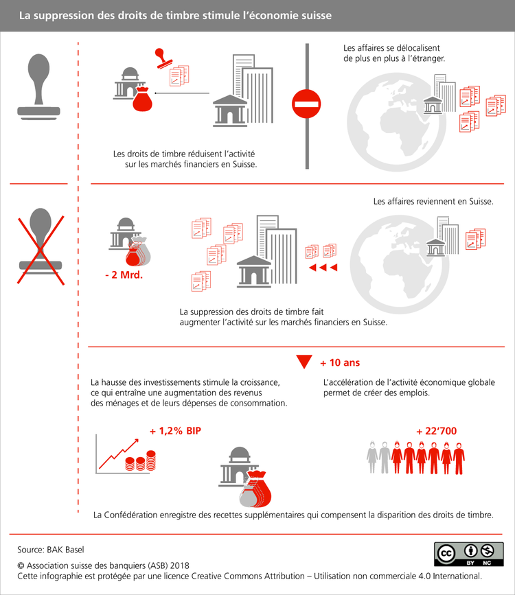 Le Conseil fédéral a publié en juin 2019 une étude réalisée par BAK Economics. Celle-ci analyse les impacts économiques d’une suppression des droits de timbre et d’une réforme globale de l’impôt anticipé. BAK Economics aboutit à la conclusion que ces réformes conduiraient en dix ans à une croissance du produit intérieur brut de 1,4 %. Cela représente environ 22 000 créations d’emplois à plein temps.