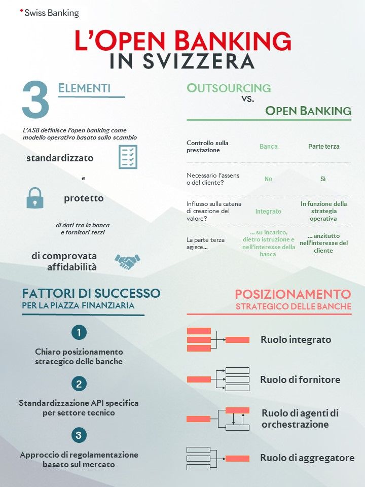 L’Associazione svizzera dei banchieri riconosce le opportunità che scaturiscono dall’apertura delle interfacce e della cooperazione con gli operatori terzi. A tale riguardo, è essenziale che tale apertura non avvenga soltanto in maniera unilaterale. Lo scambio reciproco di dati offre infatti un chiaro valore aggiunto a tutte le parti coinvolte, segnatamente ai clienti, agli operatori terzi e alle banche stesse.